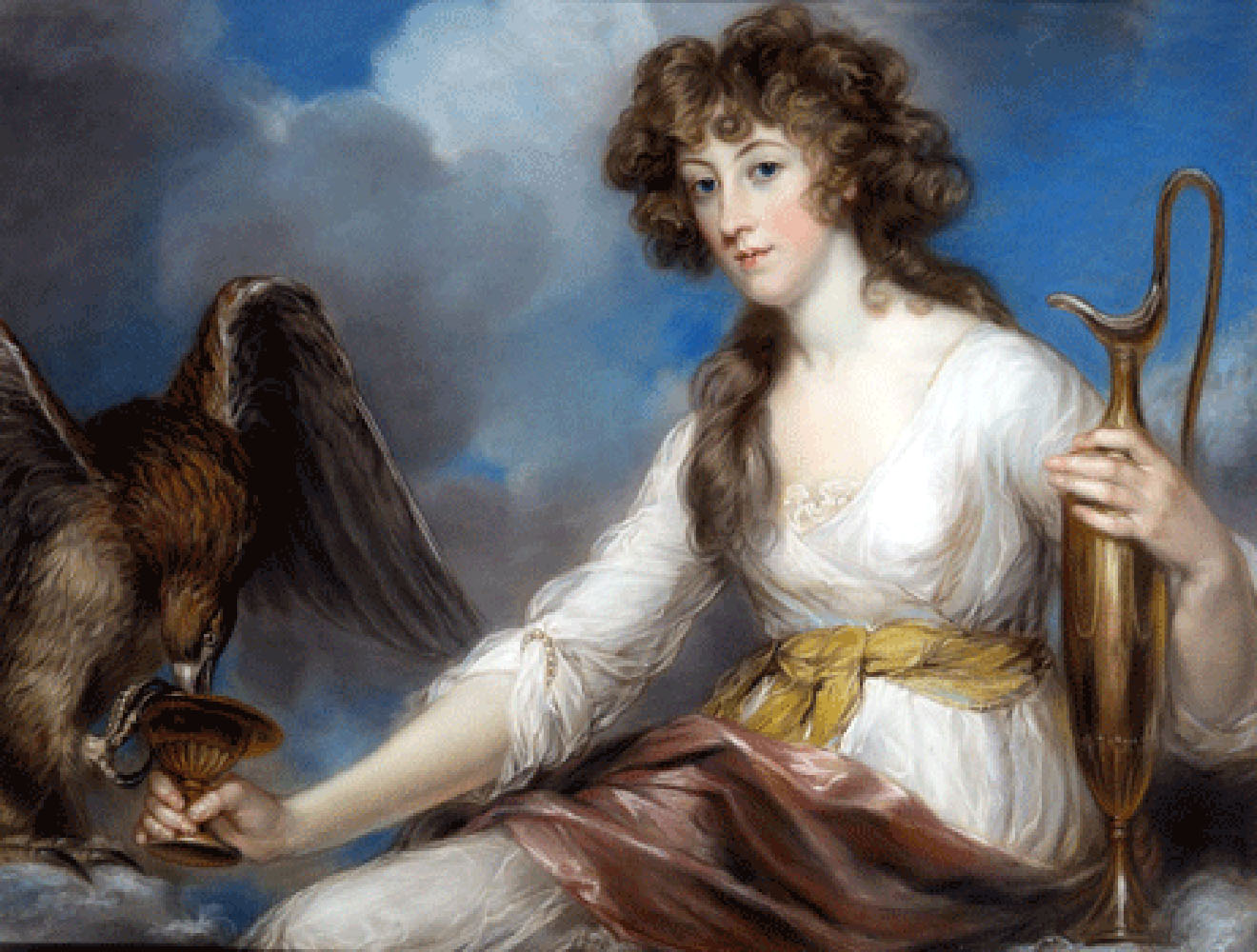 110 [94] - Portrait de Sarah White, fille de Taylor White et Sarah Woolaston, representé en Hébé. En robe blanche avec ceinture jaune et écharpe rouge, tenant une aiguière de la main gauche, et, au bout du bras droit tendu, une coupe où l'aigle est en train de boire. Signé et daté 1794, 101x78 cent. (Collection de M. Charles Wertheimer) {p. 469ai}